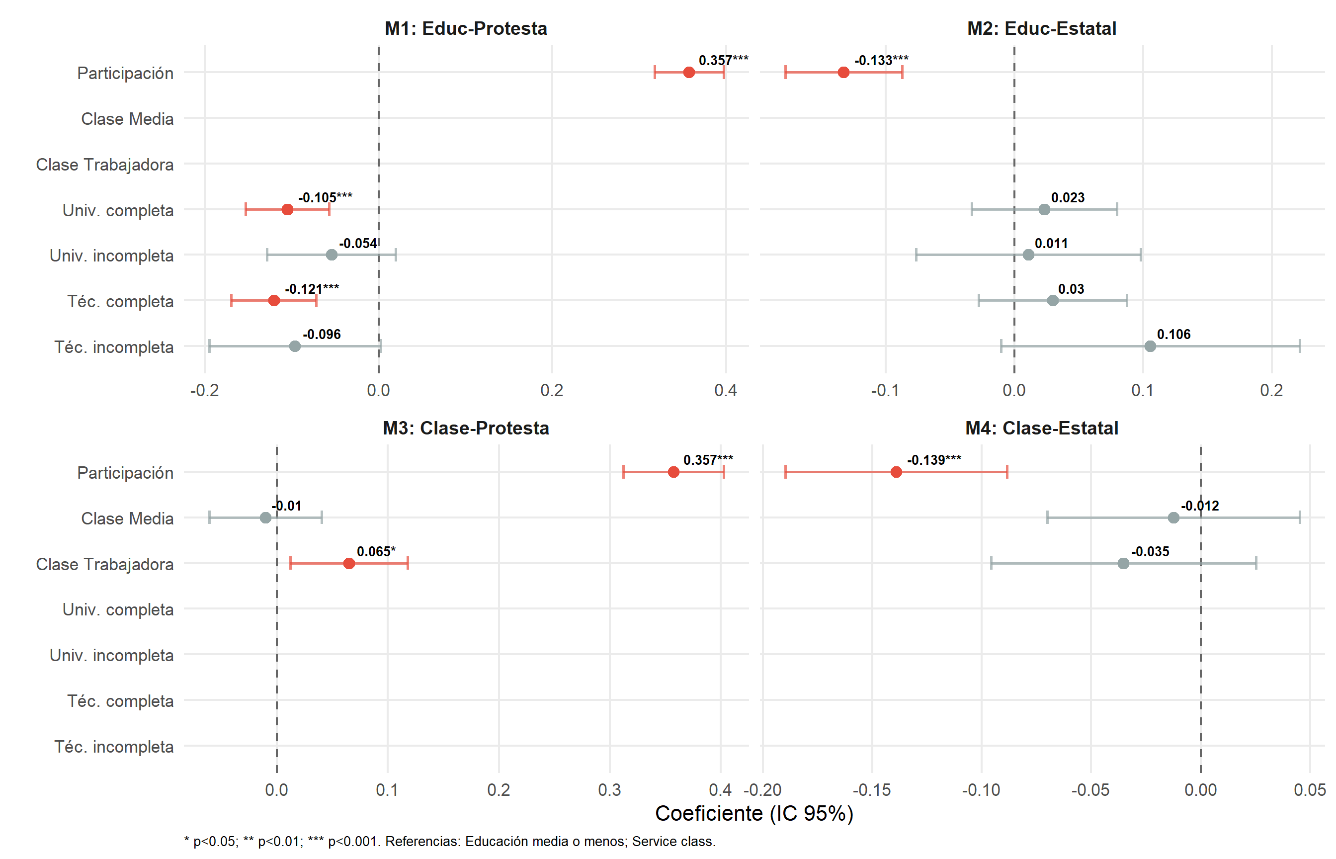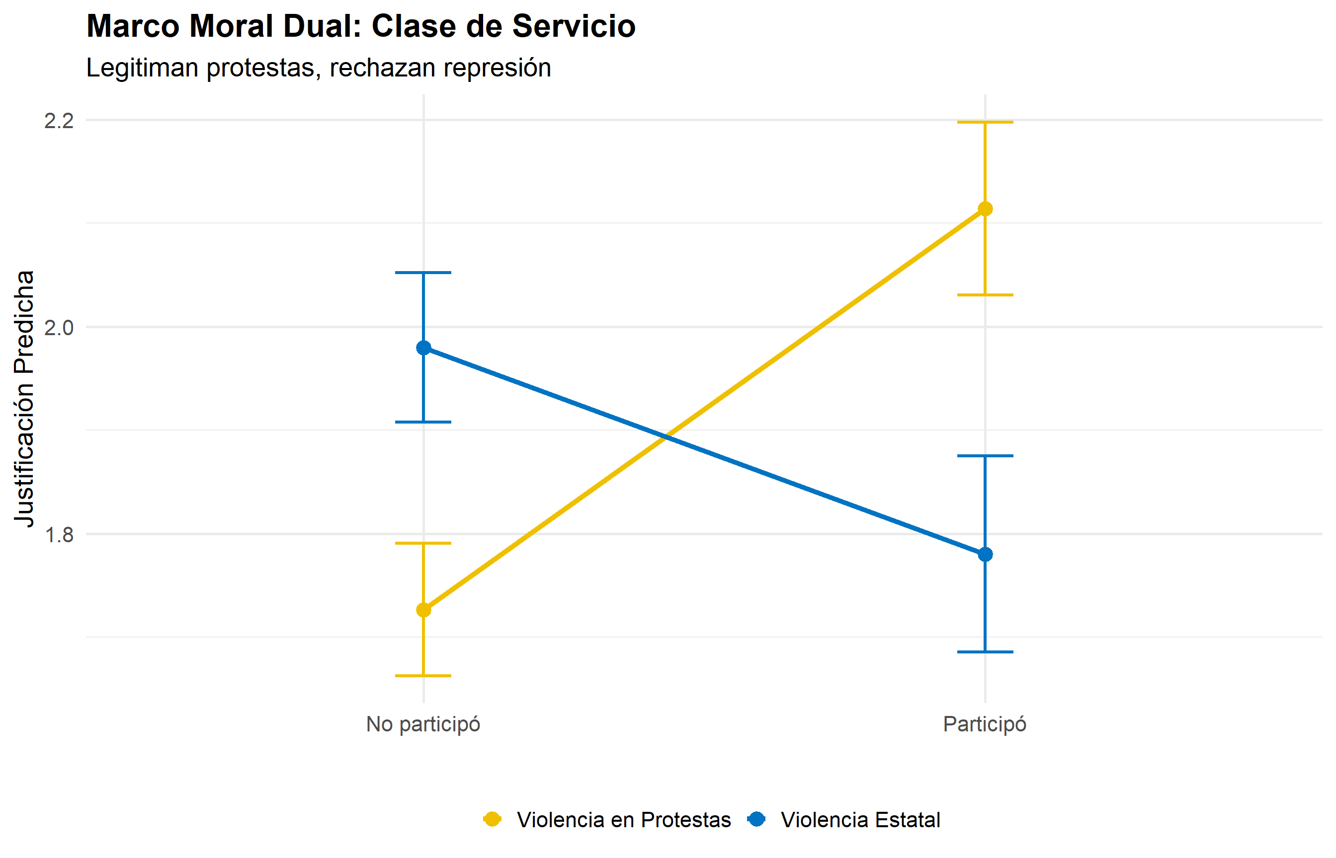 El hallazgo más llamativo la convergencia de clase el dentro de la movilización: la participación actúa como un ecualizador entre clases frente a la justificación de la violencia de diferente tipo (H3c y H3d)