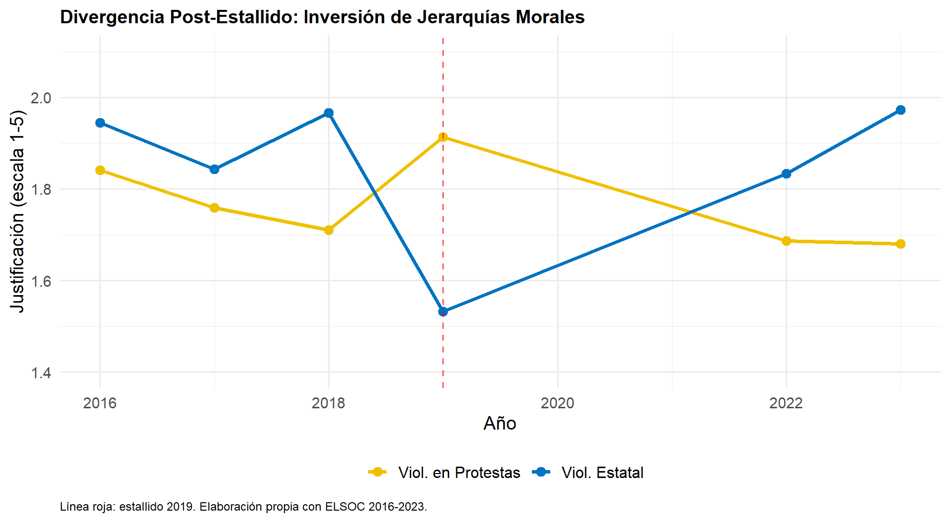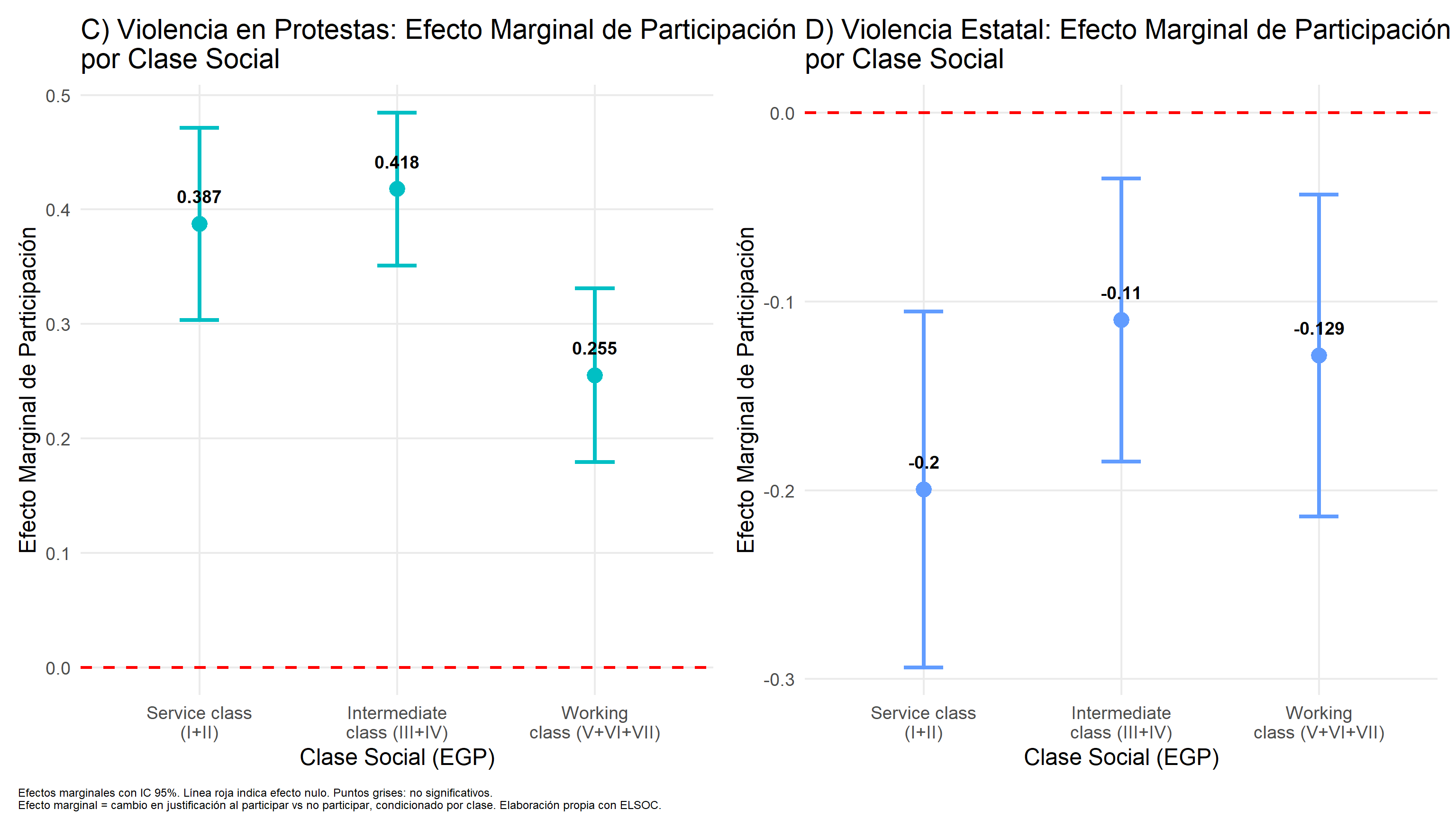 Clase trabajadora presenta justificación basal mayor de la violencia política, consistente con procesos de habituación derivados de la exposición cotidiana a la violencia estructural (Beeghley, 1986; Bottero, 2004; Olin Wright, 2005). Consistente con H2a.