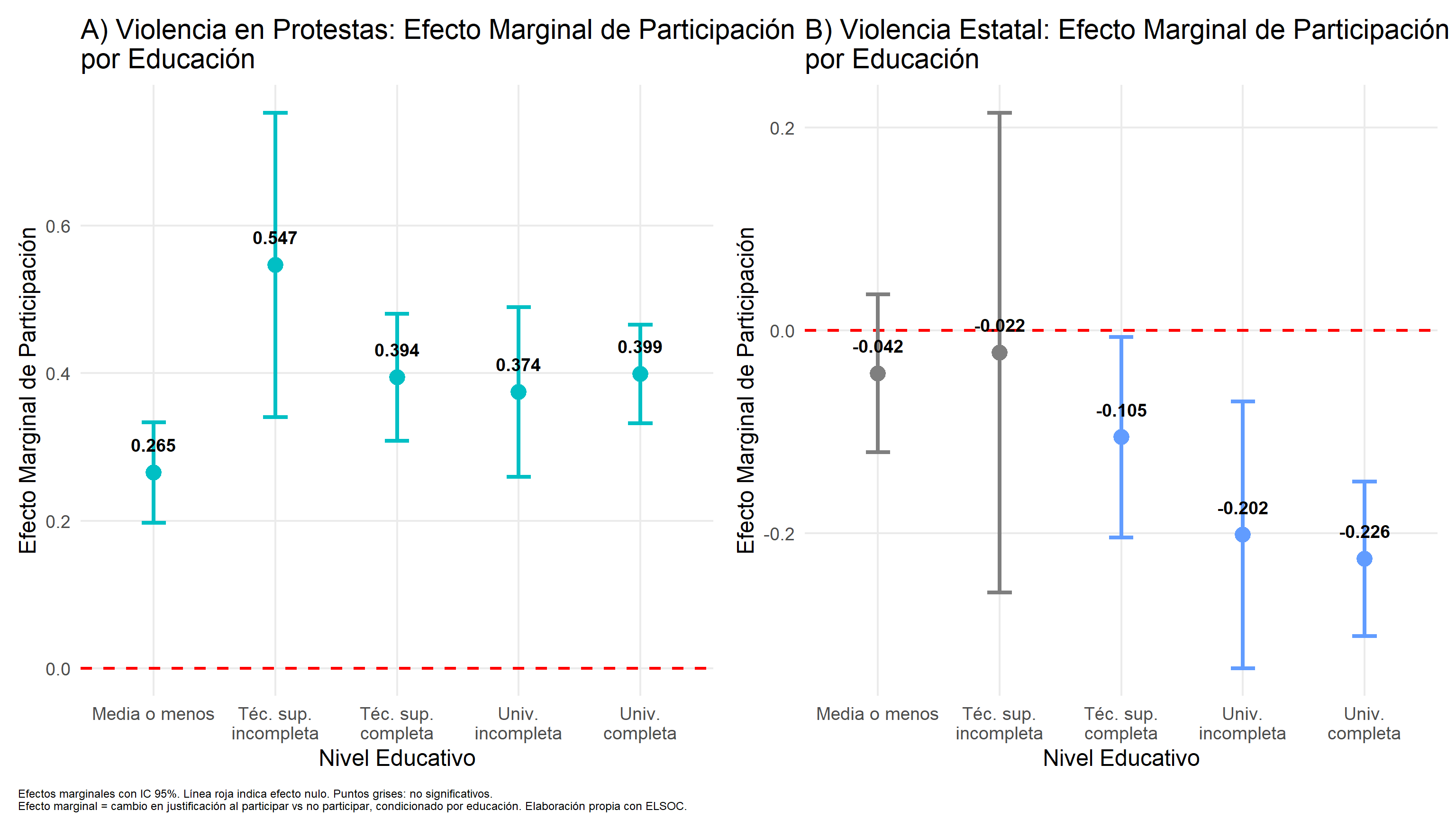 Pero este efecto se debilita cuando la persona participa de protestas. Neutraliza el efecto inhibidor de la educación (H1b se aprueba de manera parcial)